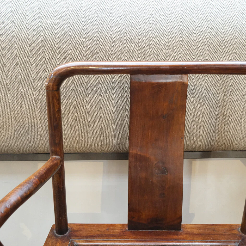 Condition Notes - Good Previously Owned Condition, features a curving back and arms, typical of the Ming official's hat or horseshoe chair design. constructed from elmwood and have a rich, dark finish. , The design emphasizes comfort and clean, architectural shapes, fitting well into various decor styles.