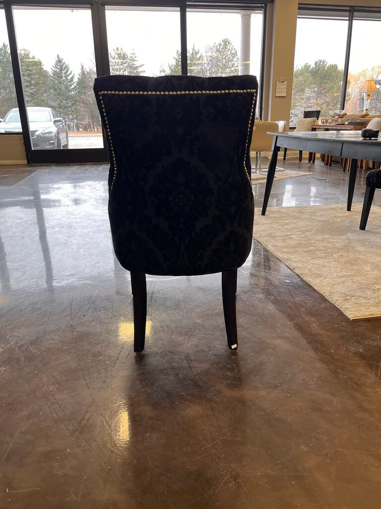 Condition Notes: Previously owned. This elegant chir includes polished nickel nail heads and a fabric of damask patterned cut outs on a flat background. The legs are finished in black. The picture of elegance this chair is sure to be a stylish addition to your home. Overall great condition.