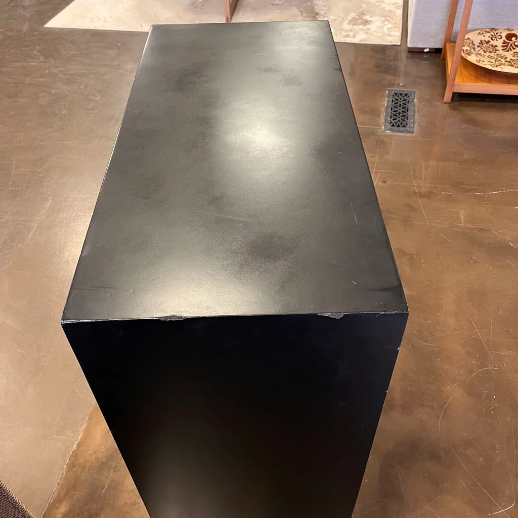 Condition Notes: Previously owned. Reminiscent of stained glass, this 2 door, one drawer cabinet will add interest anywhere. The mosaic multicolor finish is compromised of cool blues and greens and warm oranges and yellow. The colorful blocks are outlined with a contrasting black frameas is the cabinet base. unique metal door pulls add personality and an interior shelf adds function. Overall great condition.